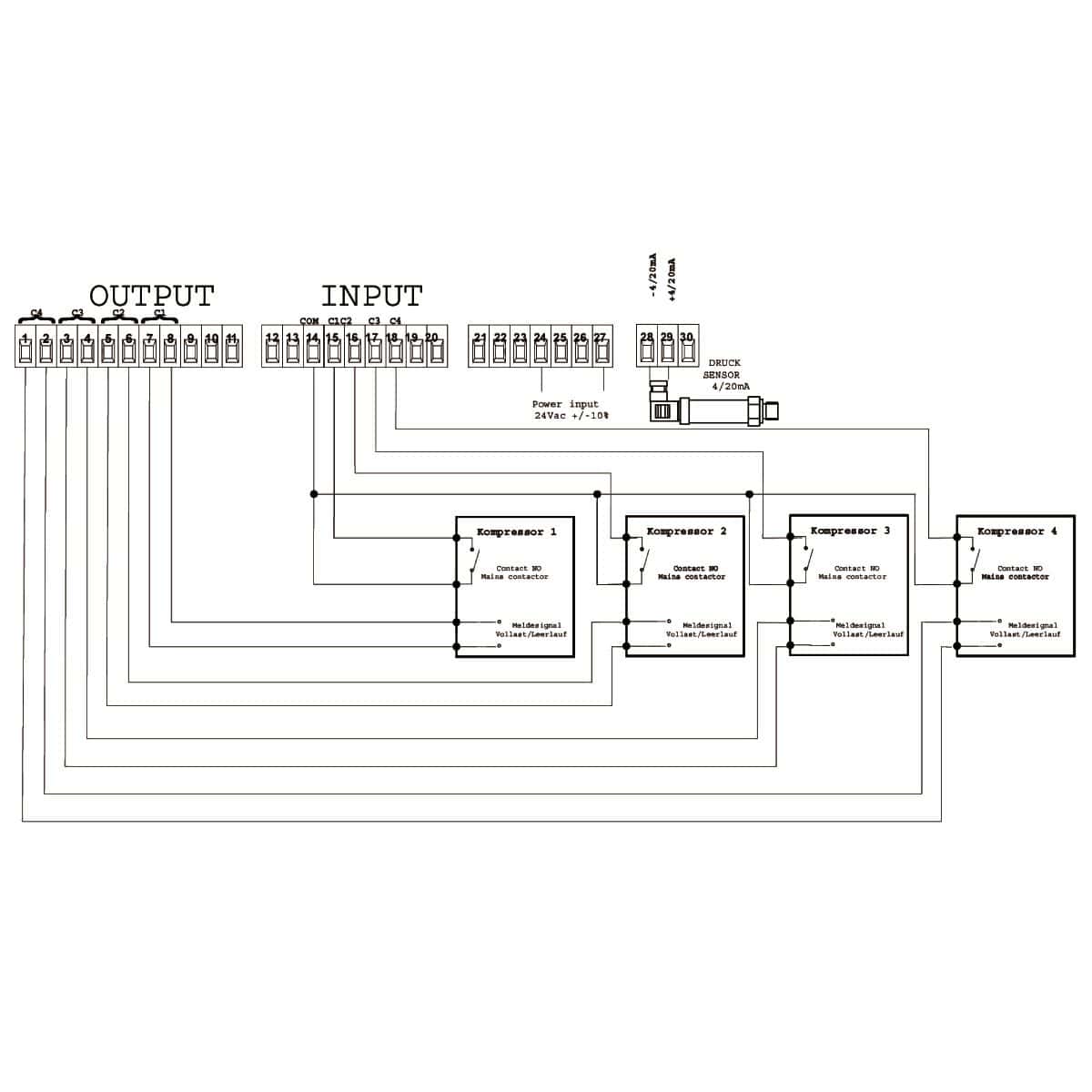Bei nicht versorgtem Steuergerät bleiben die Steuerkontakte der Kompressoren geschlossen, das heißt, die Kompressoren sind für den Betrieb freigeschaltet. Dies stellt eine Notfunktion dar, die den Betrieb der Kompressoren auch bei fehlender Versorgung des Sequenz-Controllers EASY X4 aufgrund externer Ursachen (Unterbrechung der Stromversorgung etc.) sicherstellt. Die Kompressoren werden also entsprechend den direkt durch jeden einzelnen Controller bzw. Druckwächter gegebenen Druckvorgaben betrieben. Zum Ablesen bzw. Ändern dieser Werte ist die Dokumentation der Kompressoren einzusehen.